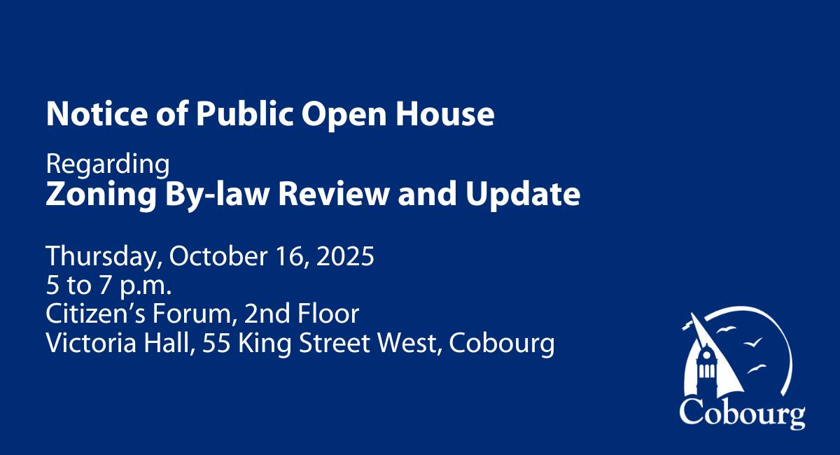 Open House Details The in-person public open house will take place on Thursday, October 16, 2025, between 5 p.m. and 7 p.m. in the Citizen’s Forum, 2nd Floor, Victoria Hall, 55 King Street West, Cobourg. Alternatively, written submissions to the Municipal Clerk, 55 King Street West, Cobourg, Ontario, K9A 2M2 in advance of the Open House are encouraged.